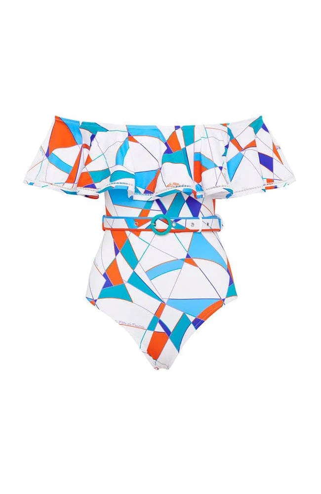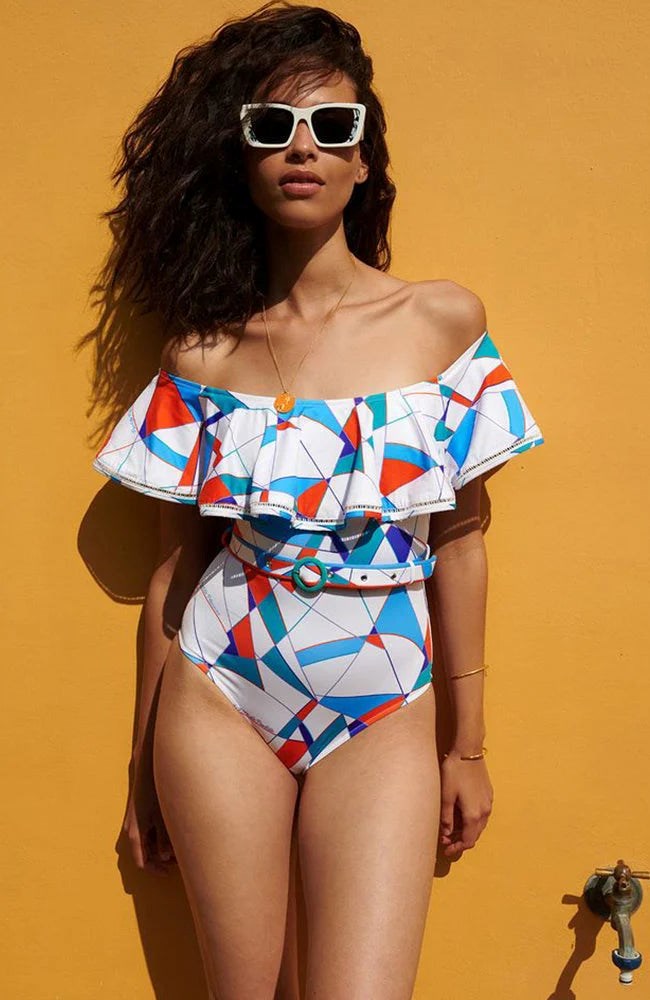 The Le Ballet Mecanique Bianca One Piece is a stunning summer swimsuit that features a detachable belt and off-the-shoulder ruffle with delicate trim edging. The medium coverage and stylish design make it perfect for making a statement at the beach or pool.